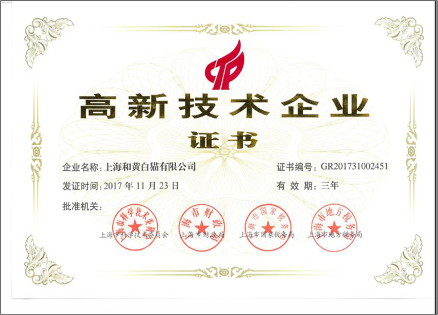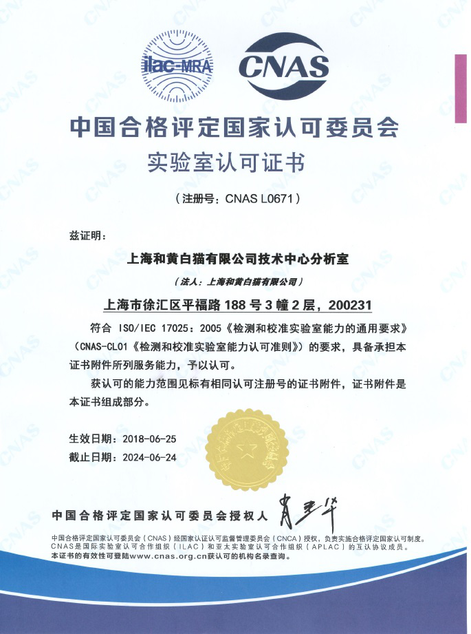 上海和黄白猫有限公司技术中心,为行业内为数极少的国家级企业技术中心,2001年即通过认定,为行业首家;技术中心实验室也于2001年被认定为国家级分析中心实验室。历经多年复审,此两项国家级荣誉保持至今。实验室规格、实验器材和装备等均已达到国内同行业先进水平,拥有气、液相色谱仪、质谱仪等多种精良科研设备。