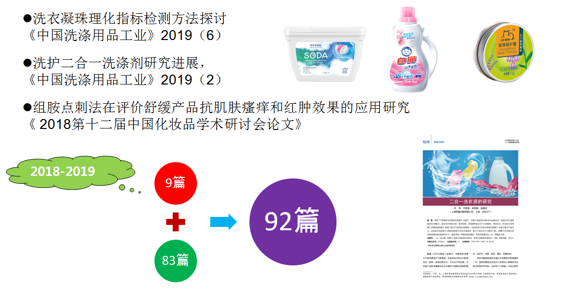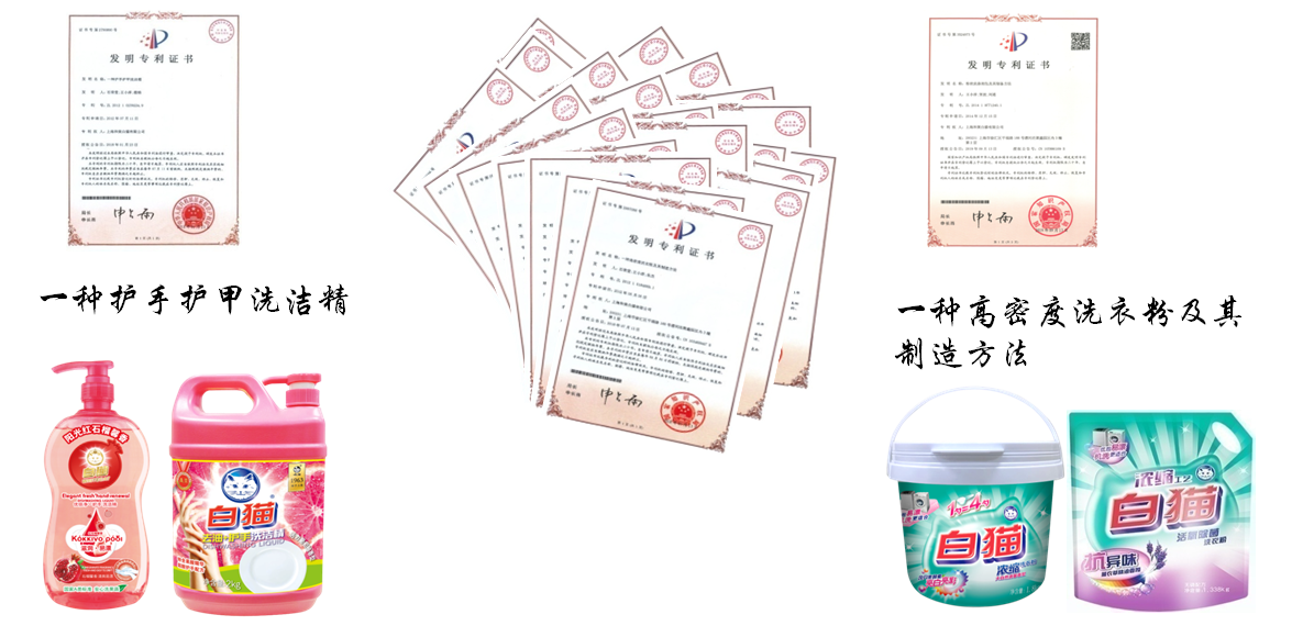 技术中心研发团队是一支知识型、创新型的人才队伍,研究生及以上学历超过70%,在家居洗涤产品配方开发方面具有强大技术力量。历年来申请发明专利93项,其他专利申请百余项,仍持有授权发明专利13项、实用新型10项。在团队成员的努力下,切实把握当代消费者在天然、健康、绿色、个性化等多方面的需求,响应国家创新升级消费品的口号,每年保持30余项新产品开发任务,并确保每年有10项以上新产品投放市场。近年来,天然苏打泡沫洗洁精、超净抗异味洗衣液、去油+护手洗洁精、天然活氧洗洁精、天然酵素洗洁精、深层洁净洗衣粉等9项产品,取得国内领先水平,龙头产品洗洁精销量稳居国内前三,洗衣液产品年增长60%以上。以技术力量助力公司成为中国洗涤用品工业的一面旗帜,为上海制造、上海品牌、上海创新的提升做出应有的技术贡献。