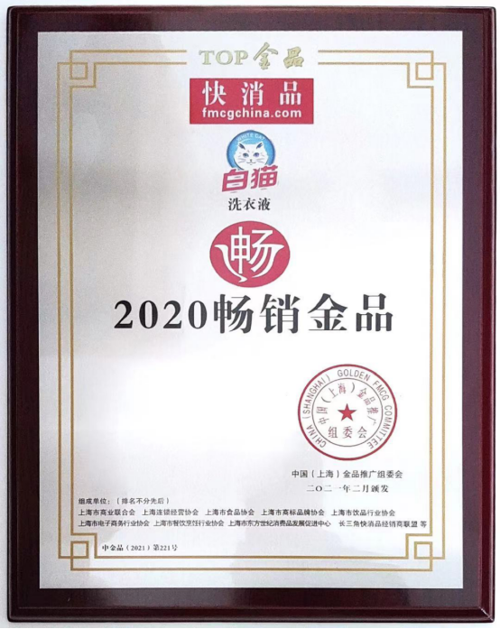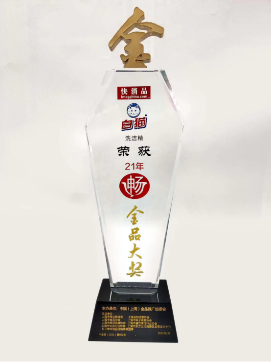 2021年2月5日,由中国(上海)金品推广组委会主办的第21届中国(上海)快消品高层年会”在上海隆重举行,白猫绿茶薄荷洗洁精和白猫阳光除菌洗衣液凭借优质的产品质量和优异的市场表现,荣获了“2020消费金品”和“2020畅销金品”。